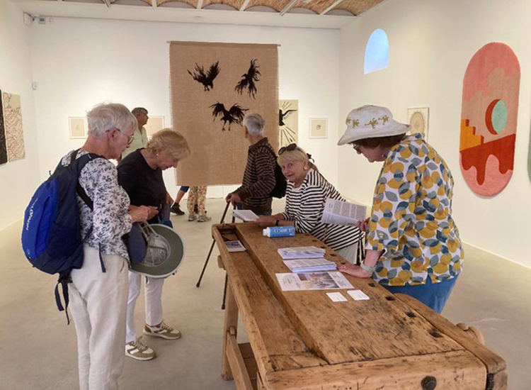 En attendant de partir pour nos visites guidées, certains d’entre nous ont visité une petite exposition temporaire, Stay Awhile, de Domino Whisker, une artiste irlandaise travaillant la broderie et la peinture.French text