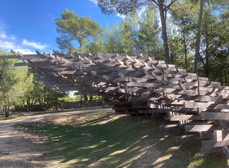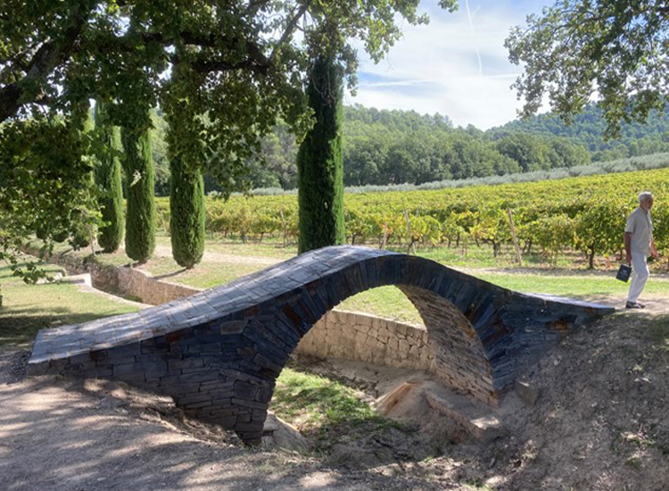 Avant de partir, l’un de nos guides, Iulia, nous a fait un bref exposé sur l’origine du domaine.  Le propriétaire, un promoteur immobilier et hôtelier basé à Belfast, a acheté 200 hectares de vignobles en 2004.  Son intention était de créer un parc de sculptures et d’architecture entouré de vignobles cultivés biologiquement. Au cours des 15 dernières années, de nombreux artistes et architectes de renommée mondiale ont créé et installé une quarantaine d’œuvres sur les collines boisées de La Coste.