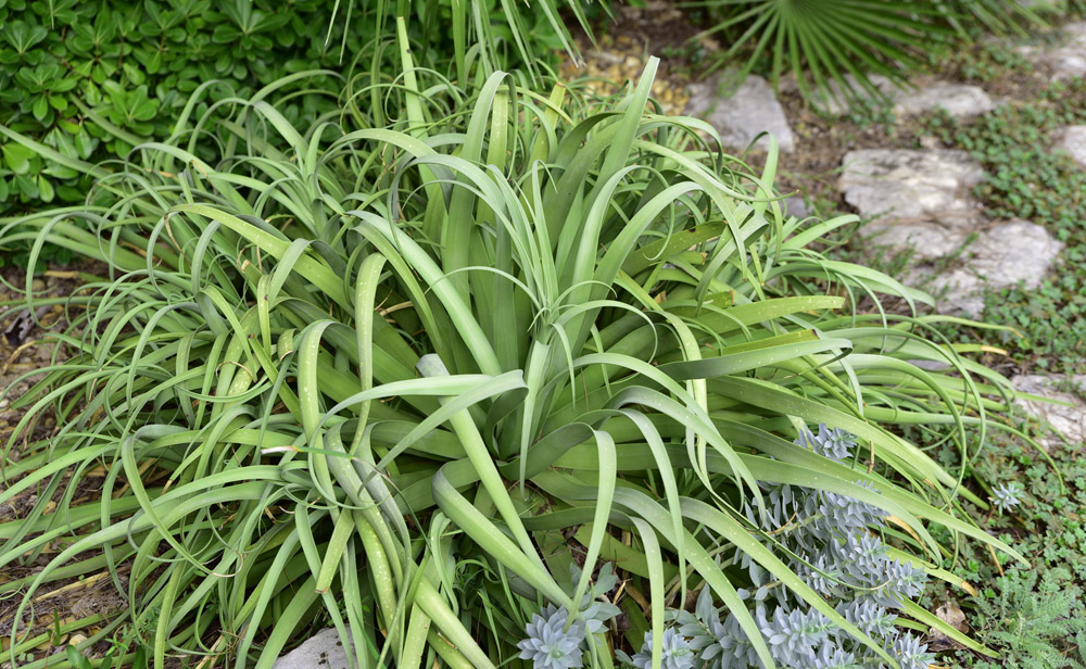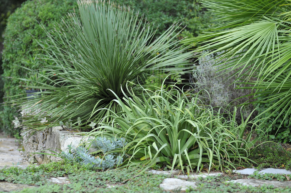 Pour donner un petit air d’exotisme au jardin, il est installé près d’un Dasylirion sp, d’un palmier Chamaerops humilis, d’un Pittosporum tobira ‘Nanum’ et d’un Teucrium fruticans. Une Euphorbia myrsinites s’est semée à ses pieds.