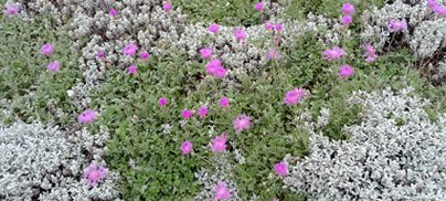 Ballota acetabulosa en premier plan, Achillea clypeolata (à gauche) et une rivière argentée de Tanacetum densum subsp. amanii se mélangent naturellement pour former un tapis dense.