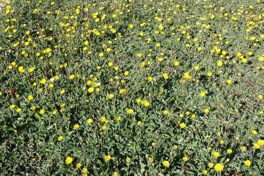 Tanacetum densum subsp. amanii entremêlé avec Psephellus bellus (syn. Centaurea bella), toutes deux allélopathiques et très efficaces pour inhiber la germination des mauvaises herbes.