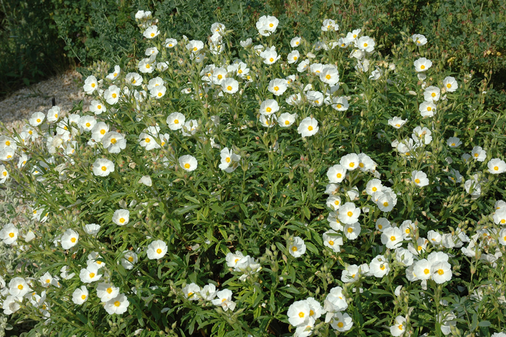 Leaves – toxins are slowly released into the soil by the decomposition of shed leaves under the plant. Phlomis can grow into large bushes, under which lie a carpet of leaves depositing allelochemicals into the soil. Most cistus varieties behave in a similar way. Cistus x ledon creates a ball of evergreen foliage with highly scented leaves and shoots, but is also able to support the competitive root growth of pine and oak trees when growing close by.