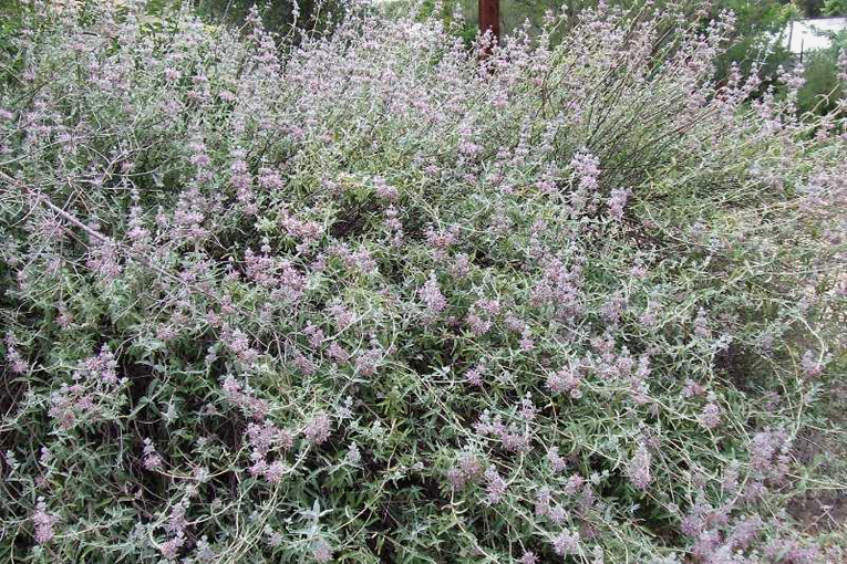 Plant aroma – though a flower’s scent is primarily to attract pollinators, the allelopathic properties in the aroma from the leaves can both deter herbivores and have other effects. Fluctuation of temperature during the day or night can stimulate the production of ‘volatile monoterpenoids’, a sort of perfume ‘bubble’ that is emitted into the atmosphere around the plant. These ‘volatiles’ condense in the dew on the soil around the plant releasing toxins. Some salvias, in particular Salvia leucophylla, behave in this way.