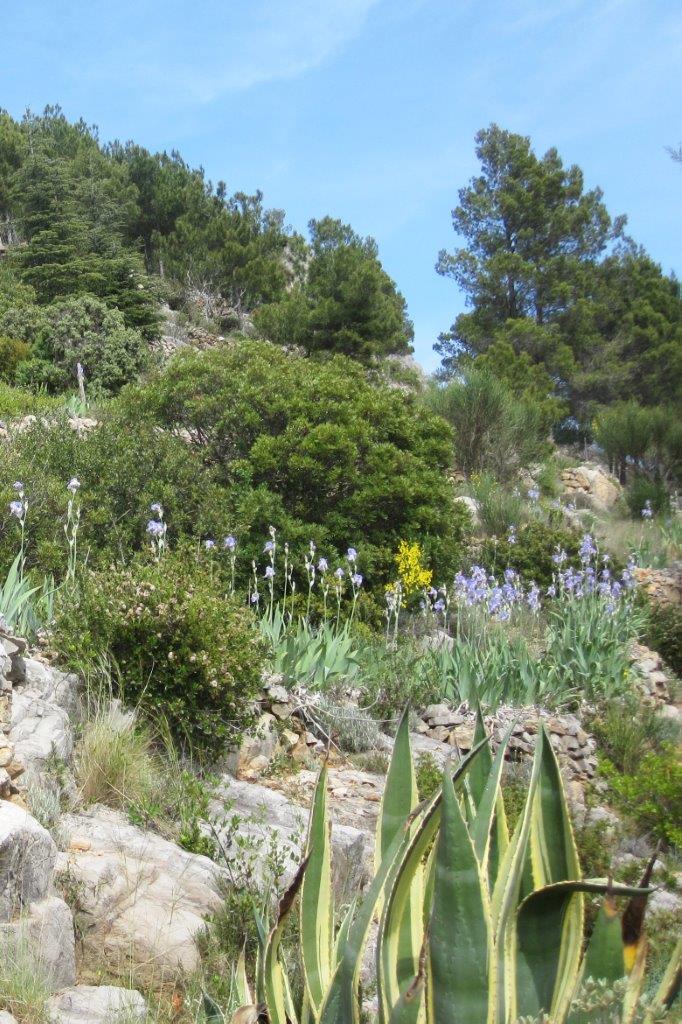 There is a collection of mimosa, with an unusual blue-grey leafed one, Acacia balynea ‘Purpurea’. On the highest level there are plants of the region, juniper, rhamnus and lentisk.