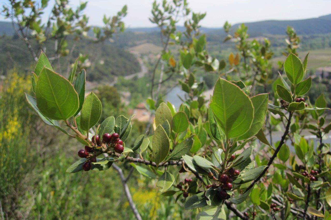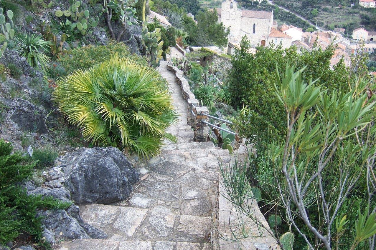 Le Jardin Méditerranéen de Roquebrun is a garden run by an association, CADE (Collectif Agricole pour le Développement et l’Environnement) which has as a number of objectives including the preservation of endangered species and research into aromatic and medicinal plants. The association took on the site in1988 after it had been abandoned for over a hundred years. Dominated by a Carolingian tower, the garden is on a south-facing cliff overlooking the river Orb. It is protected from the Tramontane wind by dolomitic hills and benefits from a micro-climate which enables many exotic plants to grow.
