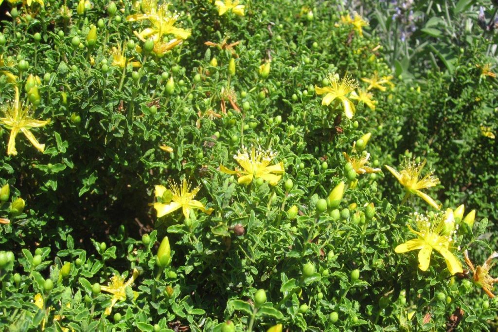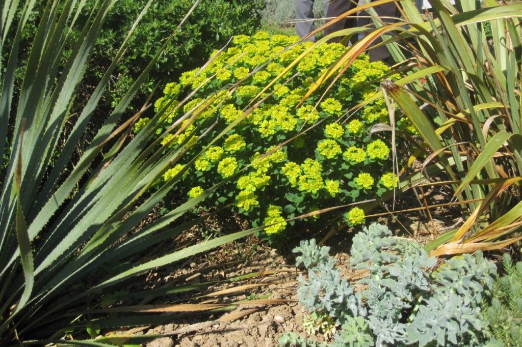 The earth is sandy and unlike Jenny’s heavy water-retaining clay, the water drains away instantly. Here are a multitude of drought-tolerant plants: Nepeta x fassenii ‘Six Hills Giant’, a number of hardy geraniums, wallflowers, madonna lilies, rosemary, cistus, lavender and phlomis. Below the planted terraces are wooded terraces with a path between holm oaks leading to a finalast open grassy terrace. Andrew said the plant he likes the best is his Salvia officinalis, though there was some discussion as to whether it really is officinalis as the leaves are pinnate. It was mingling attractively with a Hypericum balearicum that I particularly liked.
