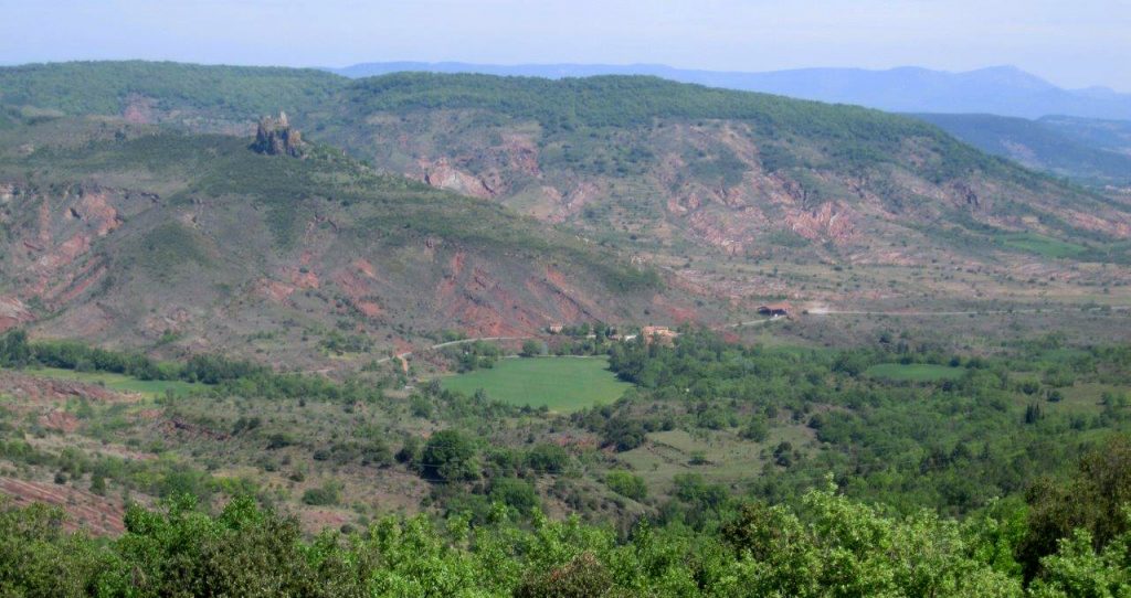 Andrew and Margaret’s garden, also on a steep slope, was different again. From the balcony of the house there are breathtaking views of Lac du Salagou with two extinct volcanoes and marvelous red soil contrasting with delicate spring green foliage.