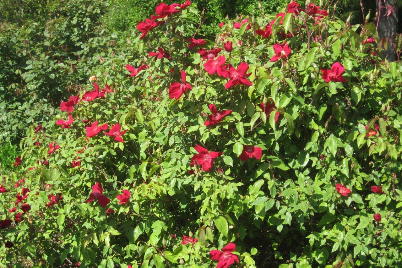It is immediately obvious that Jenny loves plants. The variety is stunning, with lots of roses in bloom including Rosa chinensis ‘Sanguinea’ and starting to climb vigorously up an ash tree, Rosa ‘Mme Alfred Carrière’. There is a spiky bed with Agave americano, Kniphofia sarmentosa and K. ‘Geant’, Yucca alifolia and a number of salvias and euphorbias – in fact, on the list Jenny gave us, there are thirty nine plants in this bed.
