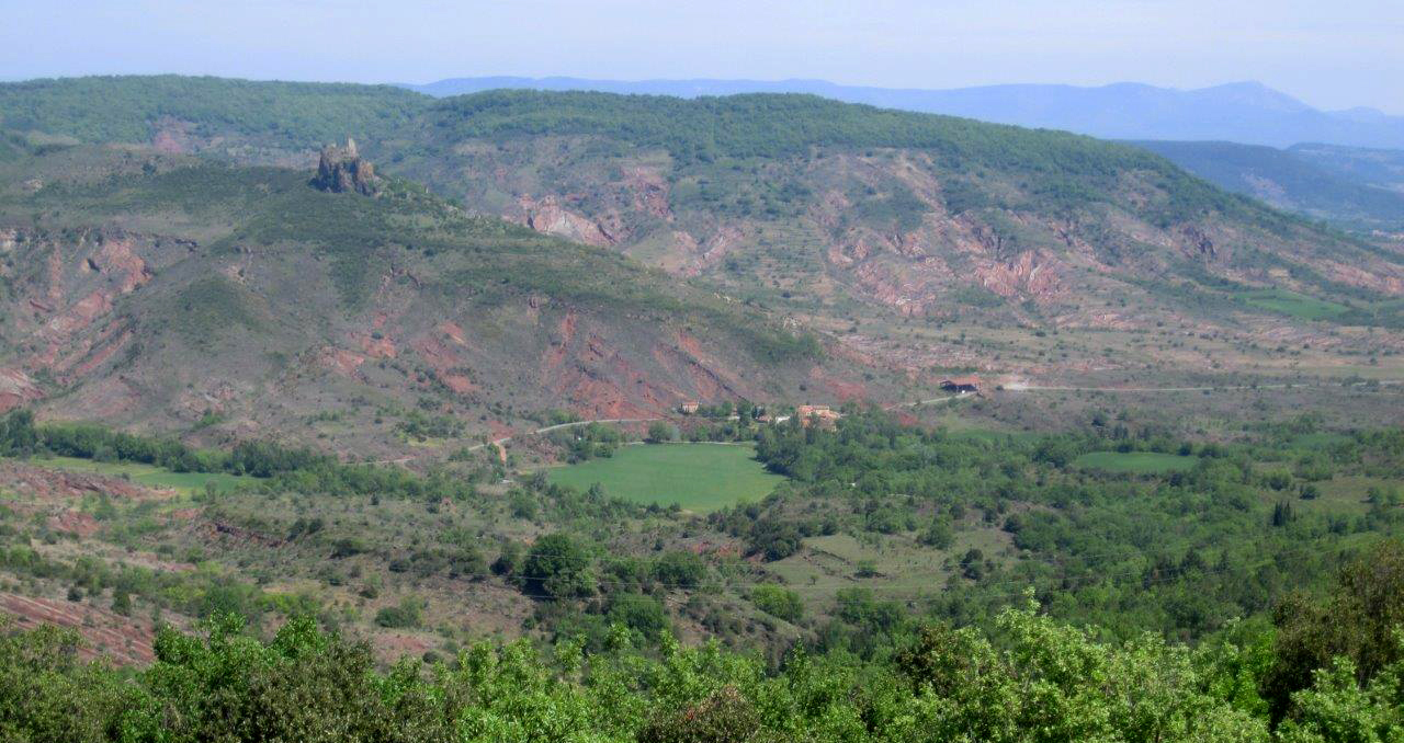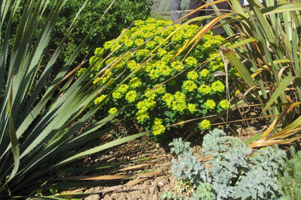 Andrew and Margaret’s garden, also on a steep slope, was different again. From the balcony of the house there are breathtaking views of Lac du Salagou with two extinct volcanoes and marvelous red soil contrasting with delicate spring green foliage.