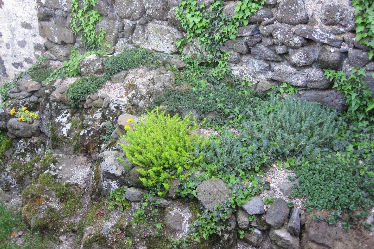 Against the north wall of the house is a small rockery created on a natural rock outcrop. There are sedums which are said to need full sun but are doing better than the same ones planted on the sunny terraces below. Sedum palmeri was particularly attractive.