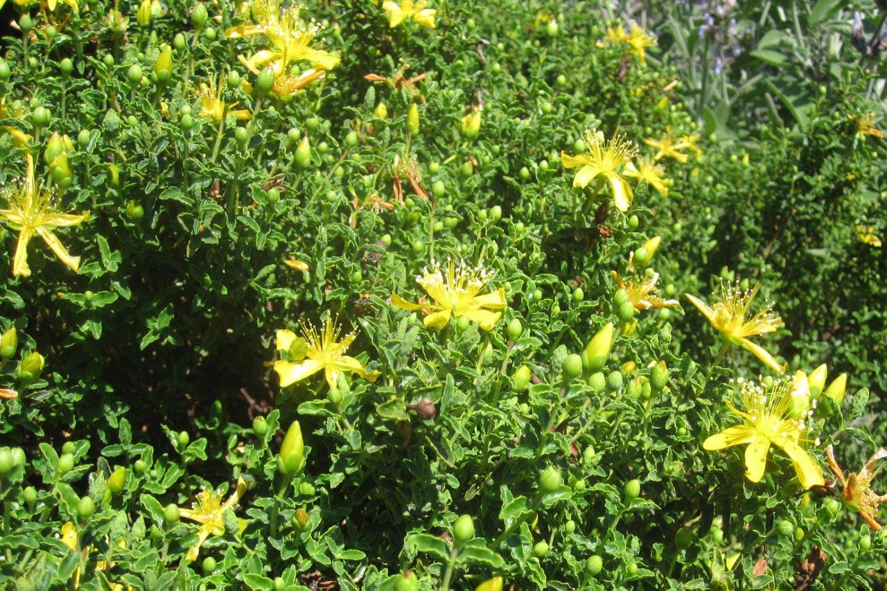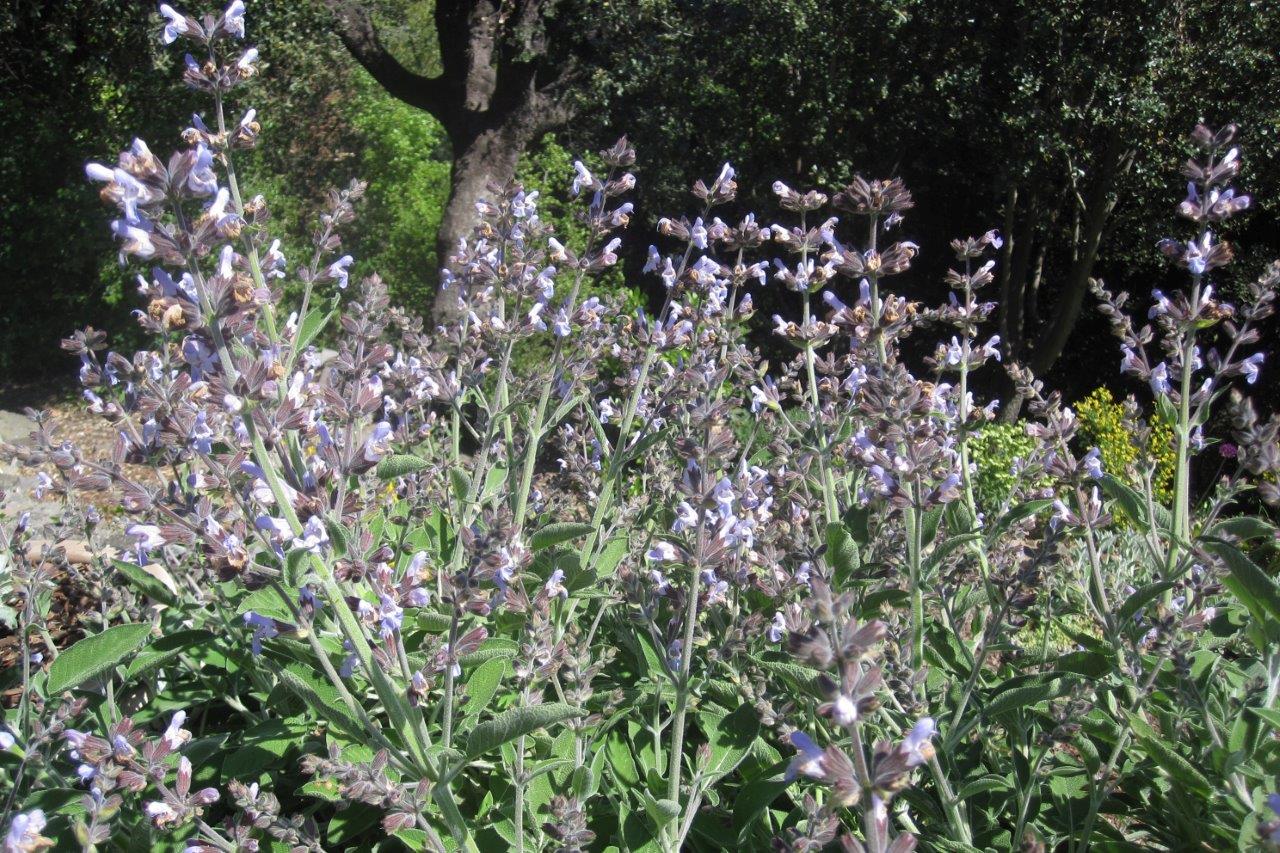 The earth is sandy and unlike Jenny’s heavy water-retaining clay, the water drains away instantly. Here are a multitude of drought-tolerant plants: Nepeta x fassenii ‘Six Hills Giant’, a number of hardy geraniums, wallflowers, madonna lilies, rosemary, cistus, lavender and phlomis. Below the planted terraces are wooded terraces with a path between holm oaks leading to a finalast open grassy terrace. Andrew said the plant he likes the best is his Salvia officinalis, though there was some discussion as to whether it really is officinalis as the leaves are pinnate. It was mingling attractively with a Hypericum balearicum that I particularly liked.