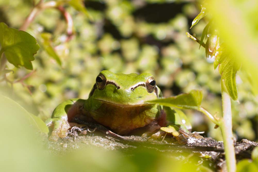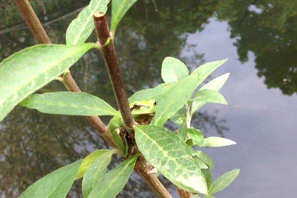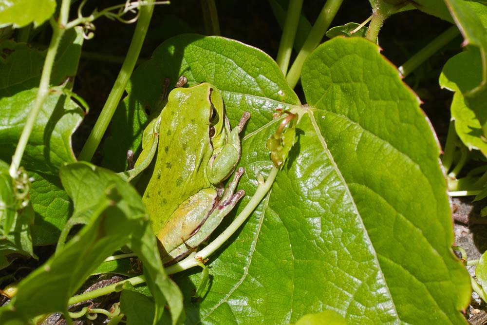 The two most popular wildlife sights during our visit link water to earth. First, the Tree Frogs, swimming through the weed on one of the ponds or clinging to leaves at its side.