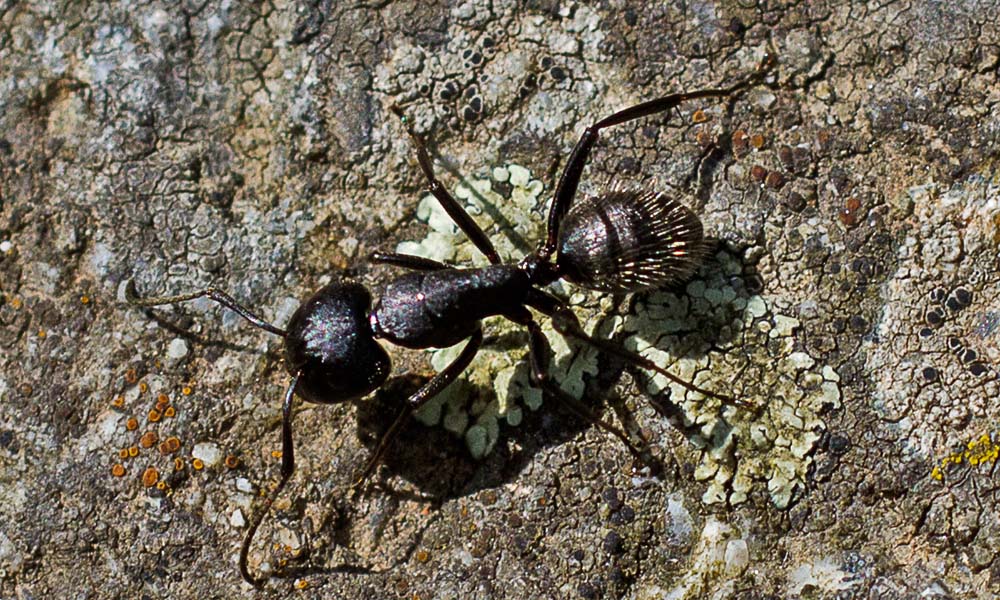 Representing Earth, a large colony of carpenter ants as long as your finger nail and dwarfing a tiny but beautifully decorated zebra spider.