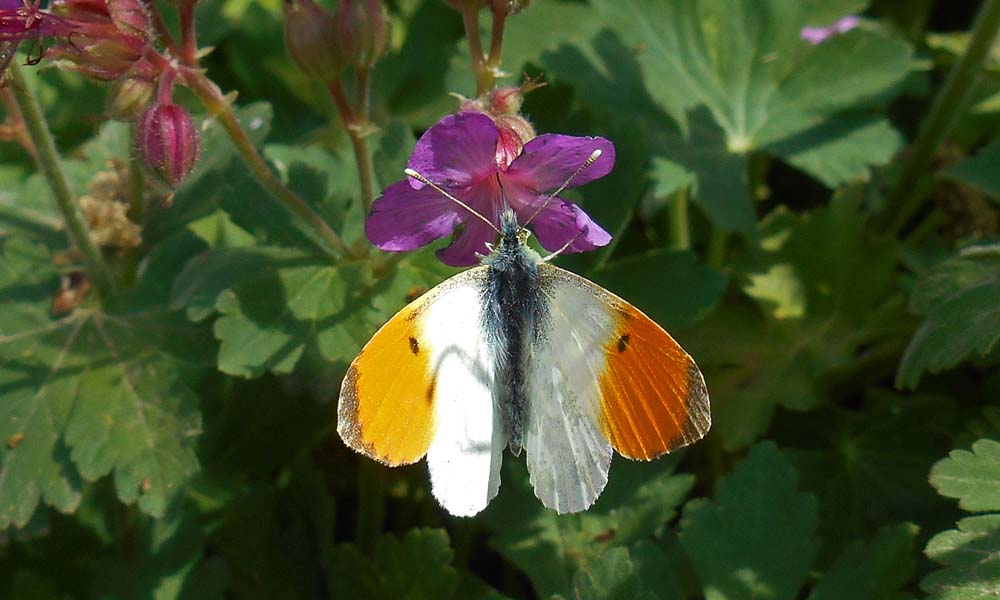In the air, or rather in a nearby tree, a nightingale (the Rarely Spotted variety) issued a non-stop commentary on Agnès’s explanation of the garden, while crag martins zoomed in and out at low level like the Patrouille de France. Lower down the aerial scale, there were butterflies: little brown ones that never stopped long enough to be identified, Small Whites, Scarce Swallowtails and lots of Orange Tips (although a trick of the light has made this one look like an Orange-and-Lemon Tip).