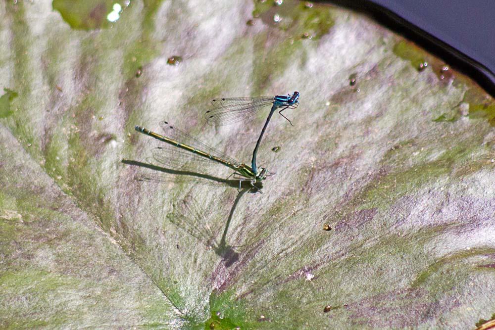Linking air to water, a Black-tailed Skimmer dragonfly hovered briefly over one of the many pools, while this pair of Azure Bluet damselflies remind us that Spring has truly sprung, the blue male guarding his mate as she lays her eggs.