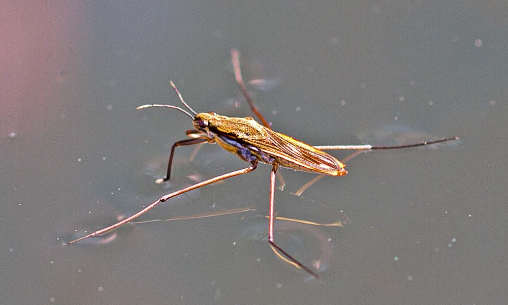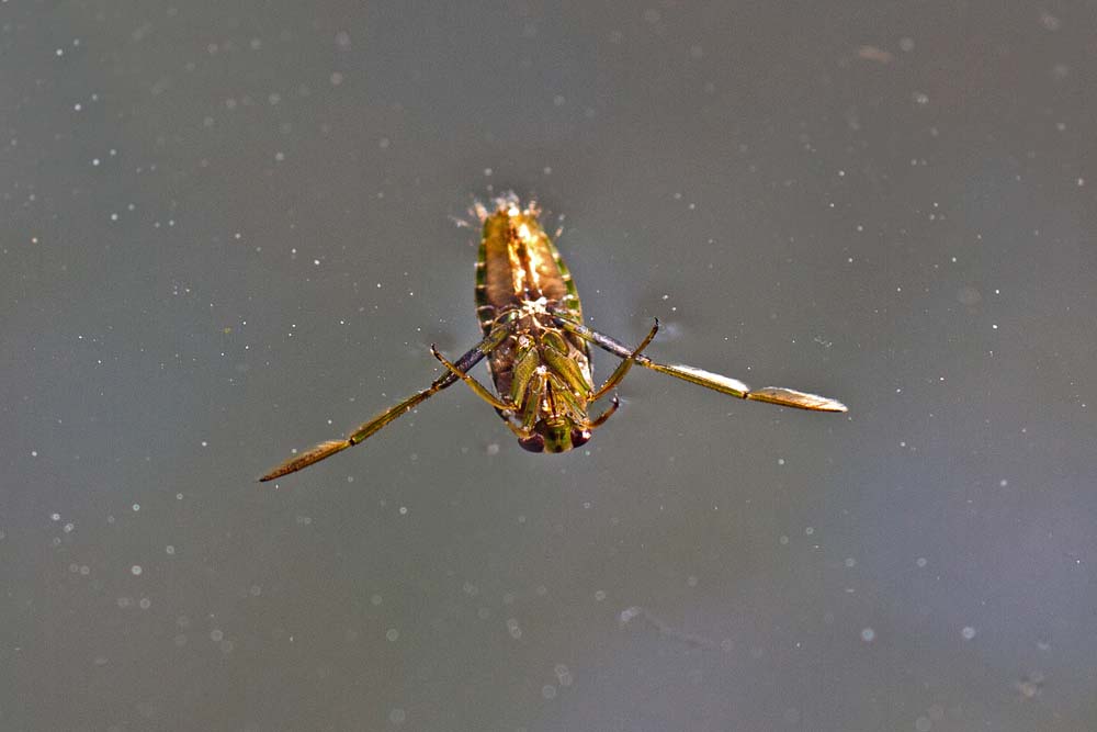 On the water, taking advantage of surface tension, dozens of Pond Skaters ran about, while in it roamed the sinister Common Backswimmer (or water boatman) who, as Nicholas explained, swims upside down to escape detection by predators from below; its iridescent back making it invisible against the sunlight. Grand amateur of mosquito larvae, it will also have a go at your finger if you let it!
