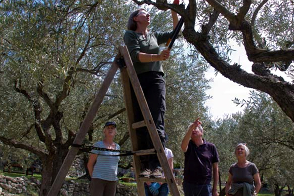 Célia a commencé par une causerie des soins aux oliviers, puis elle nous a invité à prendre nos outils et passer à la démonstration de taille. L’intérêt était vif pour le sujet et les questions nombreuses. Puis dégustation d’huiles d’olives, fruité vert, fruité mur, fruité noir, huile de la propriété et autres. Repas sur la terrasse en toute convivialité.