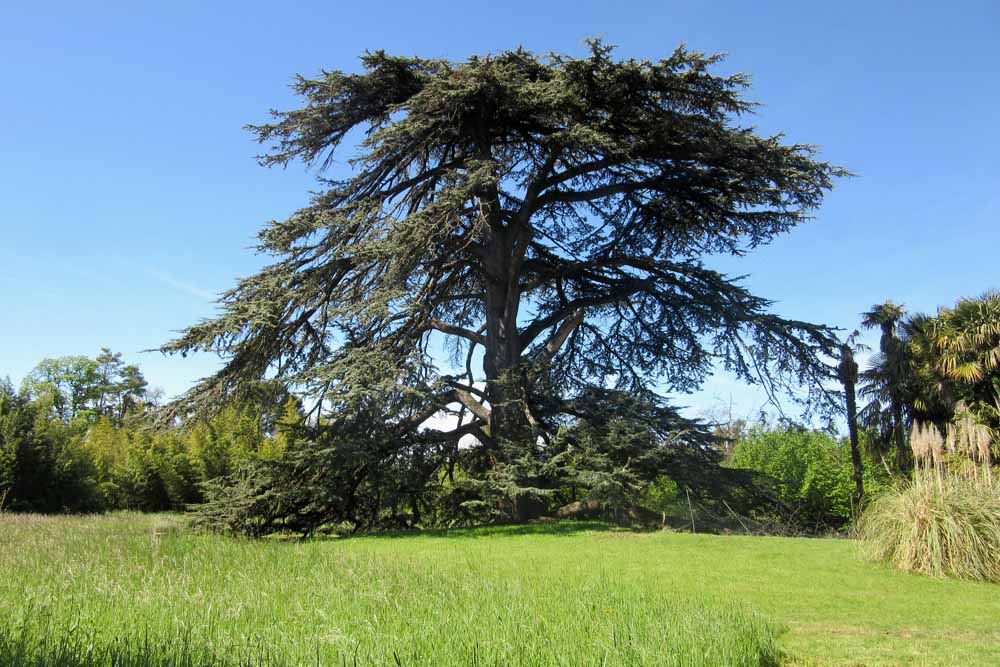The entrance is down a driveway arched over by the most venerable plane trees. The garden is centred round a magnificent Cedar of Lebanon (Cedrus libani subsp. libani) brought back from Lebanon in the hat of the botanist, Antoine Laurent de Jussieu, and planted in 1732. This tree, the first Cedar of Lebanon planted in France, grows majestically opposite the house, with a pond with a natural spring at its feet.