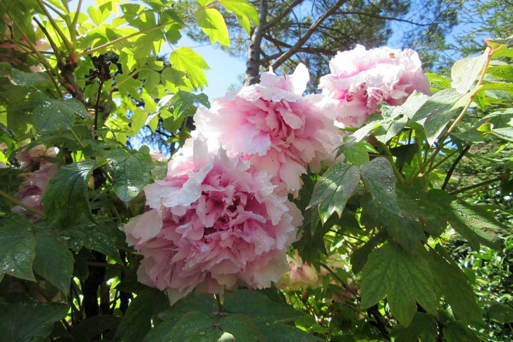 A half circle of bamboo grows behind the cedar and on all sides, trees and bushes pay homage to it. Notably, a palm tree beside the pond, a large magnolia in front, a holly tree, further out two interestingly twisted Sophora japonica, a number of lagerstroemia and an ancient campsis growing over a pergola. To the west there is a stand of hazel bushes and to the east a field bordered by a hedge of Judas trees (Cercis siliquastrum), which were in flower. Nearer the house are box and most impressive pink tree peonies.