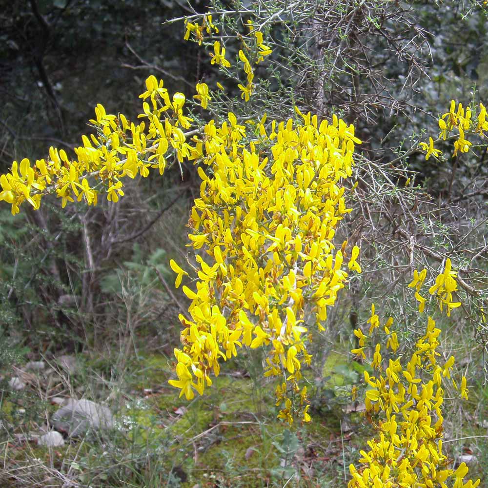 One of the paths was called Kermès, and there were a lot of Kermès oaks, along with, cade, Juniperus oxycedrus (including one very old tree with no fruit while the young ones all carried fruit), Crataegus monogyna, Viburnum tinus, Amelanchier ovalis and many others. In the open areas, interspersed with wild thyme in profusion, we found Cistus albidus in flower, a white-flowered cistus that may have been C. creticus, or C. Salvifolius or a hybrid, and yellow Ginesta scorpius.