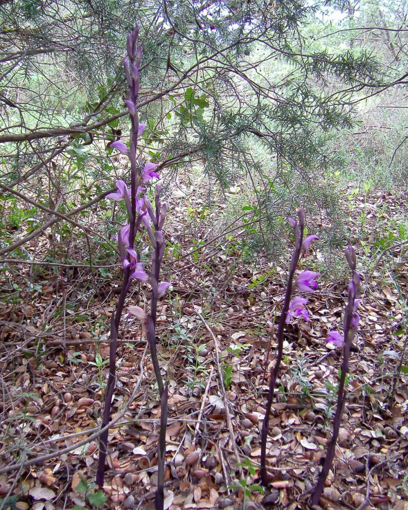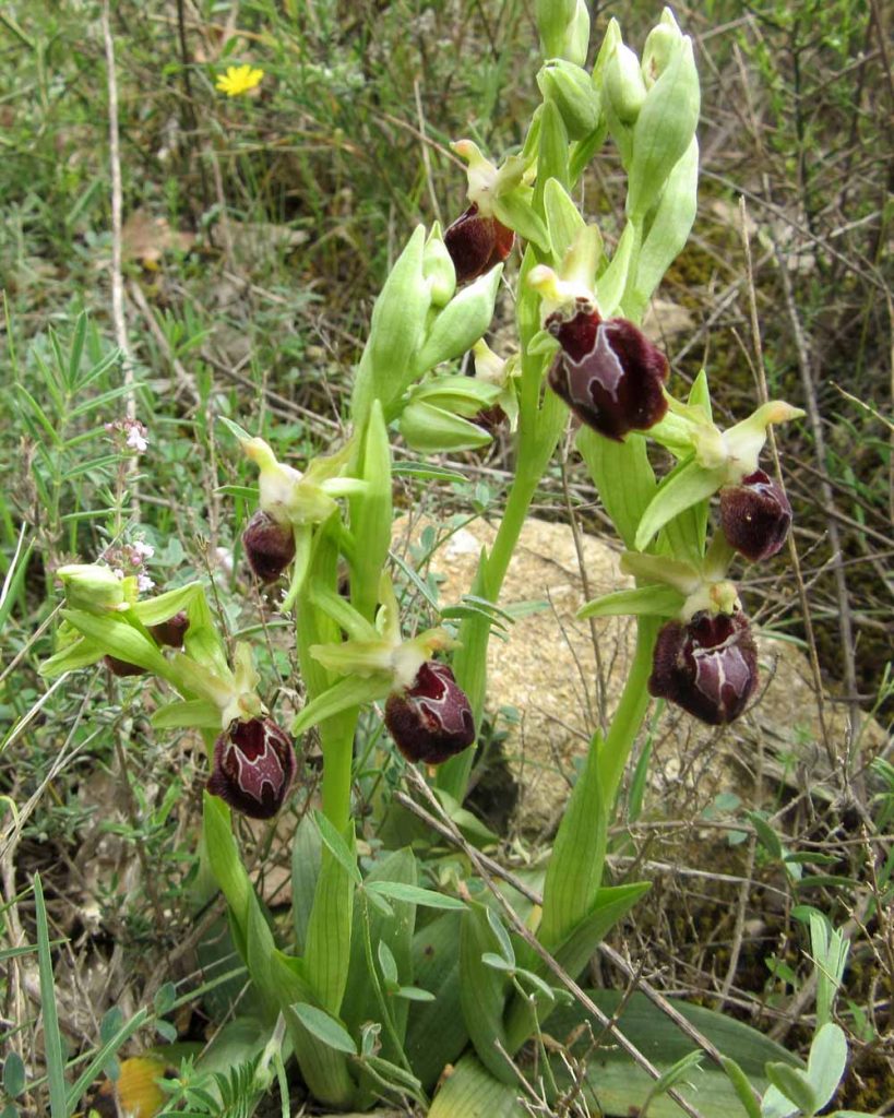 Amongst the grass were a lot of Ophrys sphegodes (Spider Orchids) and early Barlia robertiana, now past their prime. We also found a beautiful Orchis purpurea, the diminutive gold and brown Ophrys lutea and last of all, a tall exotic looking orchid new to many of us, identified as Limodorum abortivum, hiding in the shade of conifers.