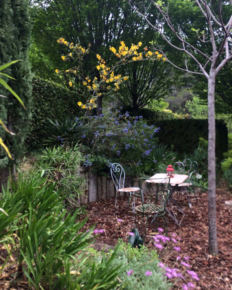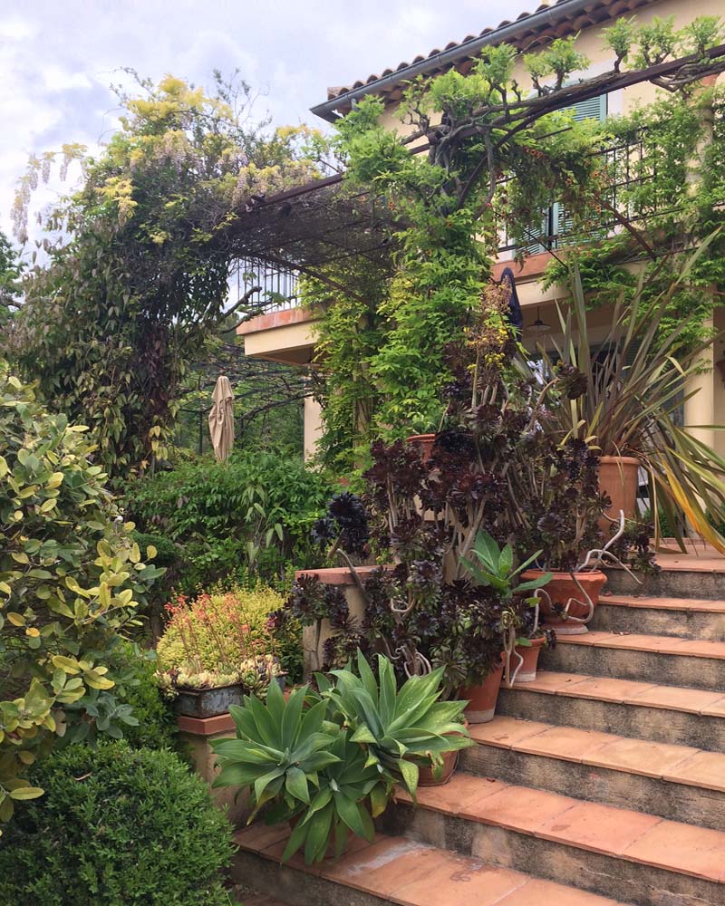 The development of Nathalie and David’s house and garden began twenty years ago. The plot was originally a vineyard and it had to be extensively excavated in order to facilitate the building of the villa and terraces which now surround it. An artesian well was discovered, and this enabled an adequate water supply for the trees and plants which were planted in the earlier years.
