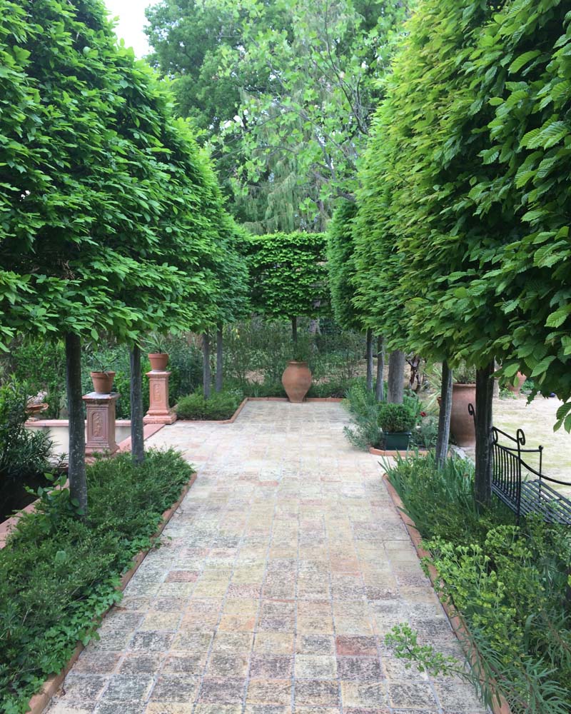 Another seating area can be found under an olive tree, on a terrace encircled with miniature box. A further area has a colourful fremontodendron and a ceanothus, underplanted with centaurea. There is a shady walkway lined with pleached hornbeams, interconnecting some of the rooms.