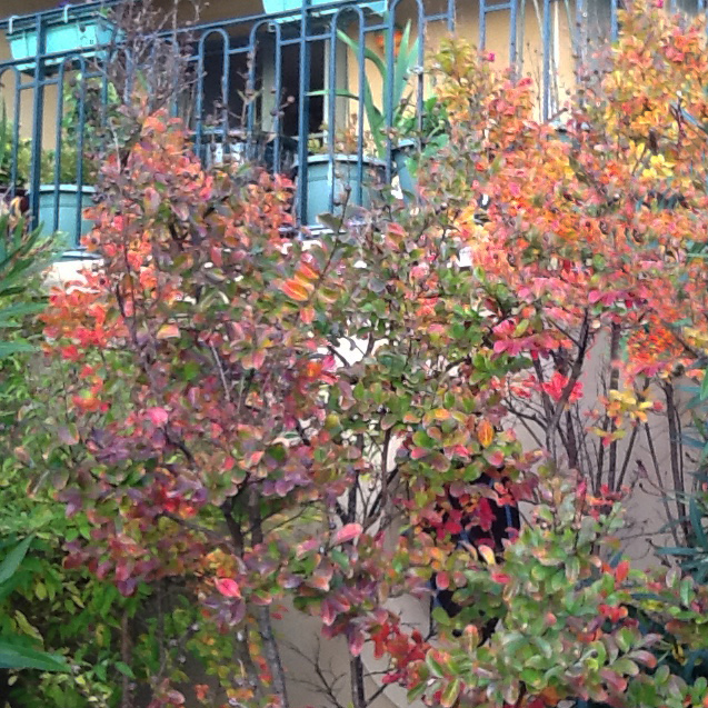 La première des deux photos ci-dessous, prise dans mon jardin à la fin d’octobre, montre les couleurs éclatantes de Cotinus coggyria ‘Grace’ parmi les gris et les verts environnants. Dans la deuxième photo, c’est les Lagerstroemia indica qui montrent leur feuillage rouge. L’arbuste aux feuilles vert jaune est un Punica granatum sur le point de changer de couleur.