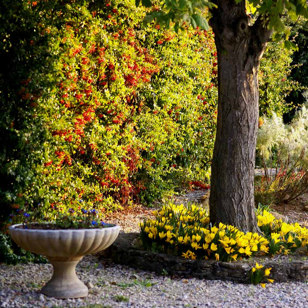 De nombreuses espèces panachées d’élaeagnus nous offrent de belles couleurs en automne. Parmi mes autres plantes préférées se trouvent: Nandina domestica qui présente de l’intérêt pendant toute l’année : le rampant Ceratostigma plumbaginoides aux fleurs bleues; et Abelia grandiflora dont la versatilité n’est plus à prouver.