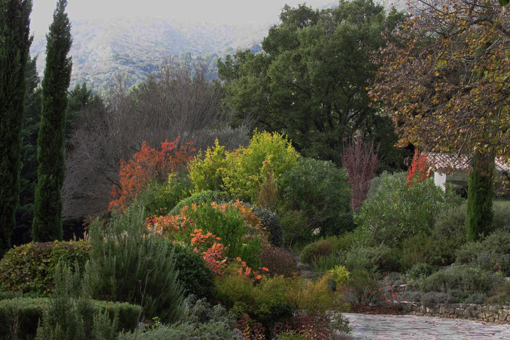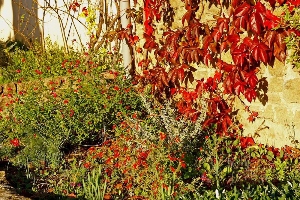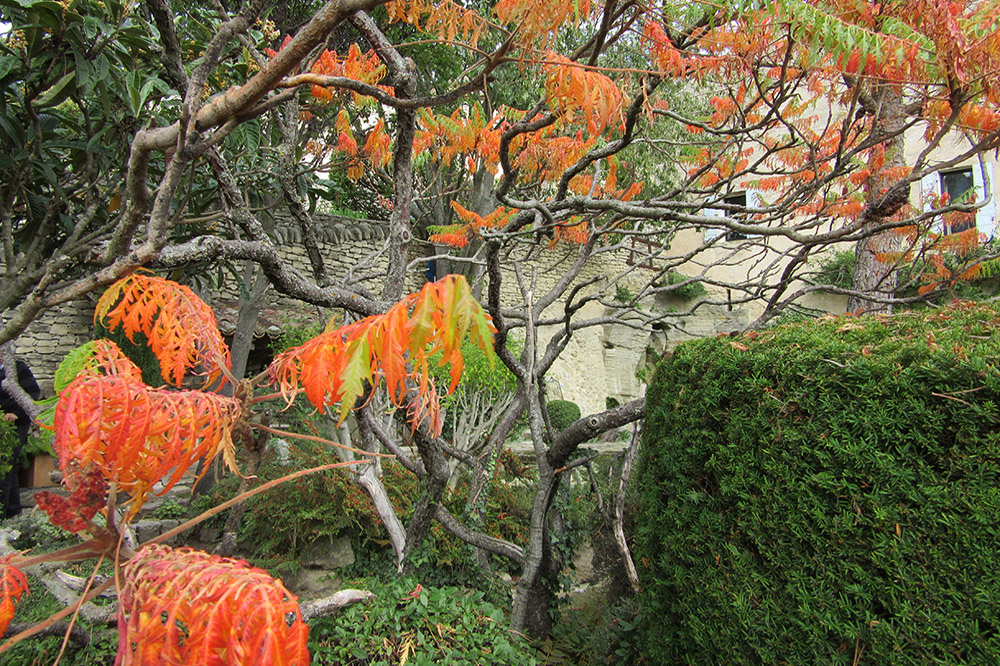 Les jardins provençaux nous offrent d’autres variations sur les couleurs : les feuilles rouges du grimpant Parthenocissus quinquefolia qui s’harmonisent bien avec les fleurs d’Epilobium canum et de Salvia microphylla dans le jardin de Guy et Mairi Cheeseman ; et les feuilles oranges, semblables à celles de la fougère, de Rhus typhina ‘Dissecta’ à La Louve à Bonnieux.