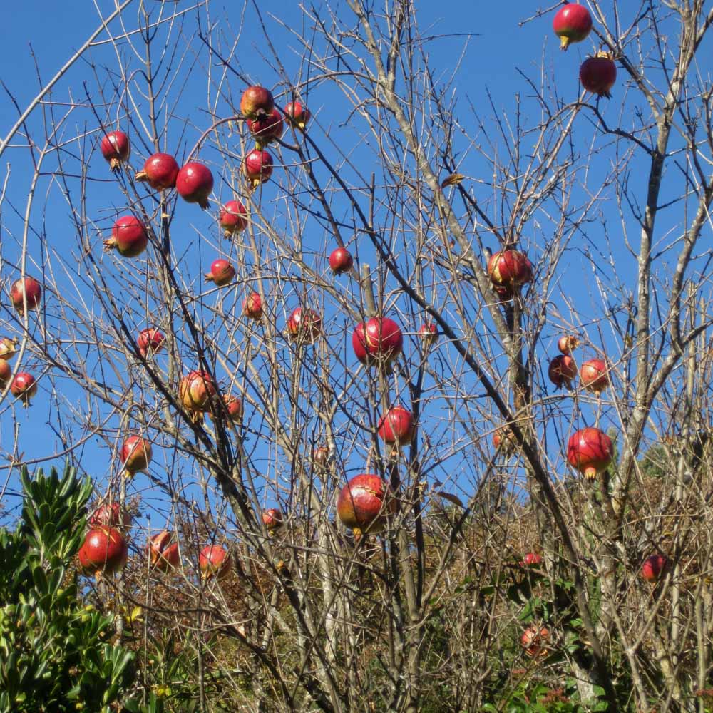 Punica granatum, the pomegranate bush, also provides a great display of colourful fruit, first set against a background of leaves, and later in the year, baubles on naked branches.
