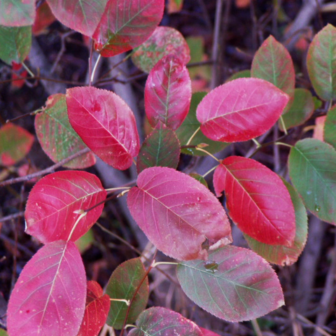 The wild plant Euonymus europaeus, or spindle tree, which is the overwintering host for many aphid species, turns red at this time of the year. It is rarely planted in the garden. Euonymus alatus is smaller, with vivid red leaves.