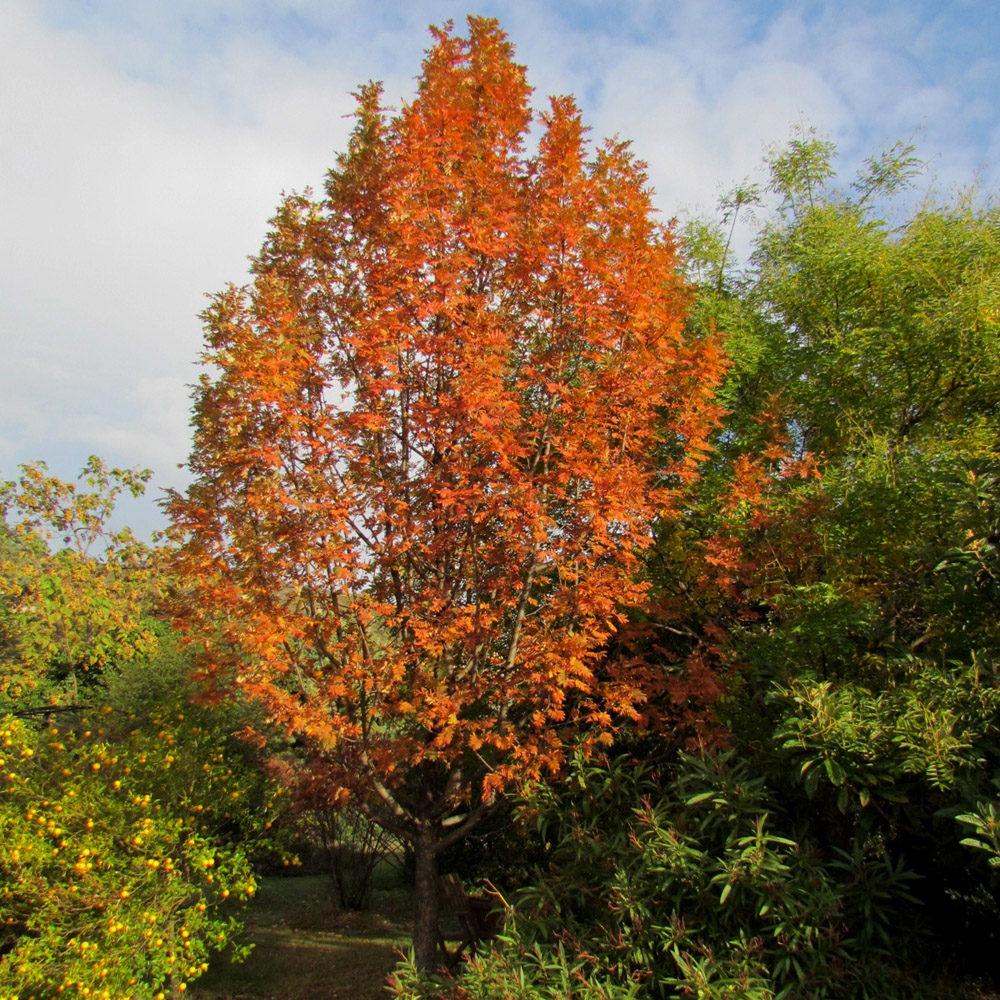 The kaki tree Diospyros kaki never fails to impress. Dark brown to orange foliage with hanging orange persimmon fruits to add winter interest. The smoke tree Cotinus coggygria is another autumn winner with leaves turning red brown to orange.
