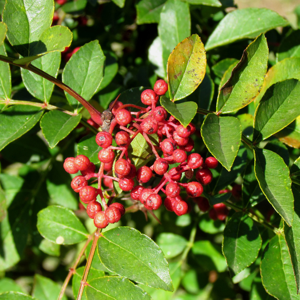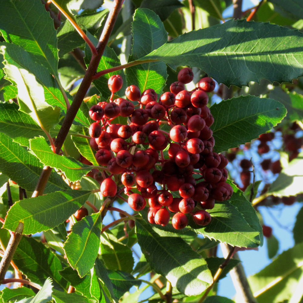 Heteromeles arbutifolia est un arbuste qui mérite d’être mieux connu. Il provient de la Californie, est résistant au froid et à la sécheresse et se pare de fleurs blanches en mai et de fruits rouges en automne, les derniers très prisés des merles! Zanthoxylum simulans, le poivrier du Sichuan, a besoin d’un peu d’arrosage en été mais a beaucoup d’intérêt pour les jardiniers. On utilise seulement les fruits débarrassés de leurs graines noires.