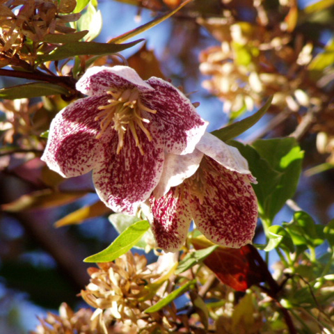 Autumn colour also comes from plants like sages, still in flower after a long flowering season and plants which come into flower in November such as Tagetes lemmonii and Dahlia imperialis, though these flowers will disappear after the first severe frost. Then we will be left with fruits and berries and winter flowering plants such as Clematis cirrhosa.