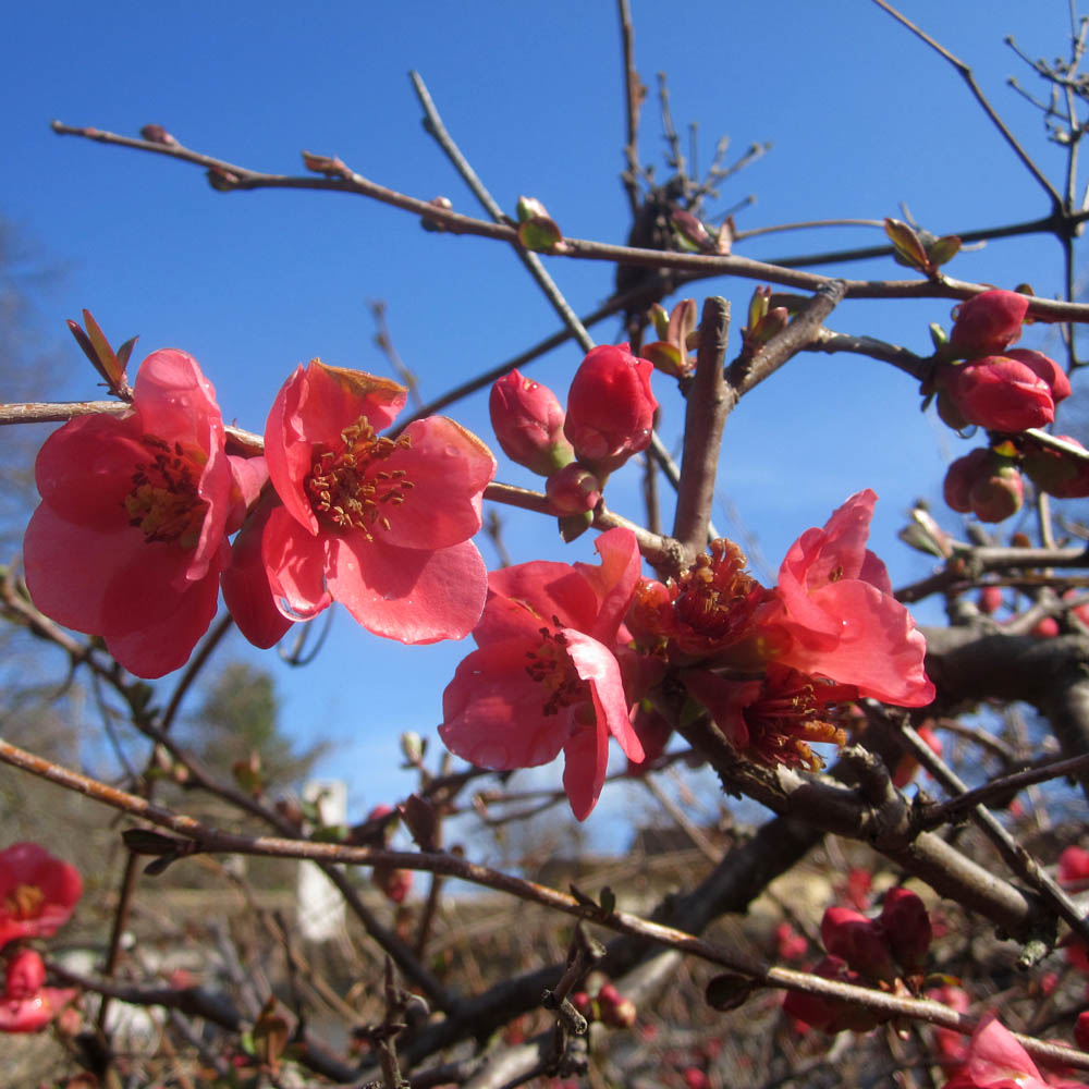 Chaenomeles with dark pink flowers / Chaenomeles et sa floraison rose foncé