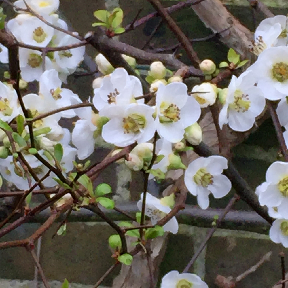 Chaenomeles speciosa ‘Nivalis’ growing against a wall / poussant contre un mur