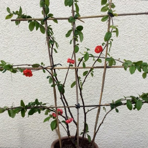 There are many cultivars. Chaenomeles ‘Coral Pink’ has magnificent pale orange flowers, visible from a distance of 10m. Chaenomeles speciosa grows well against a wall and can be trained into an espalier. The branches are easily bent and formed when young.