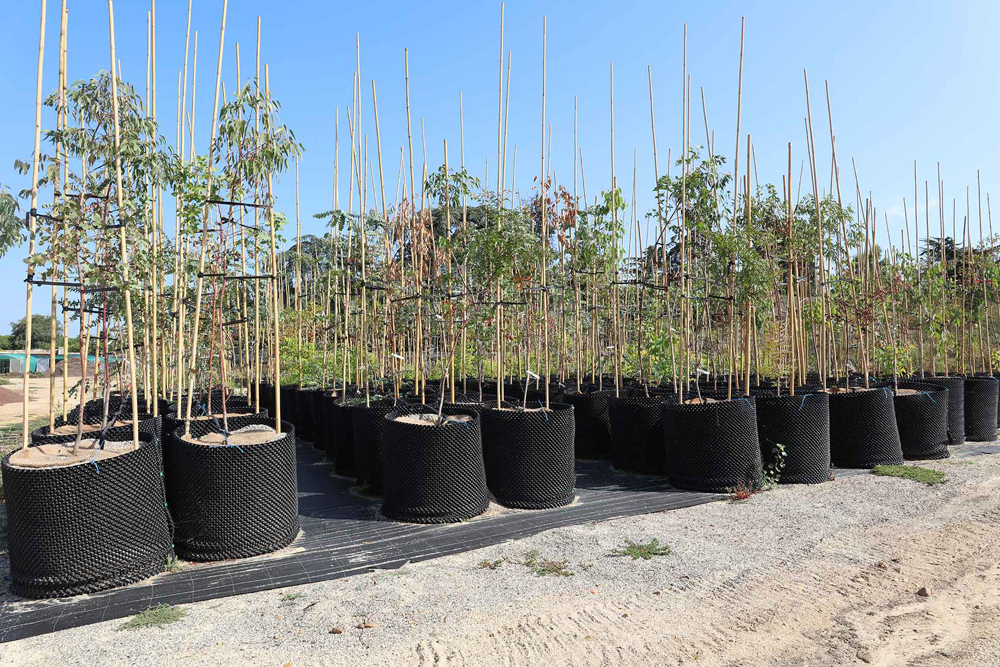 Les plantes sont ensuite placées sous un voile d’ombrage pour continuer leur croissance. Beaucoup sont cultivées en air-pot. Ces pots développés à l’origine pour la culture des Eucalyptus en Australie, sont de forme circulaire, ils sont constitués d’une paroi perforée avec des cônes fermés à l’intérieur et des cônes ouverts à l’extérieur. Les cônes de l’intérieur canalisent les racines et les conduisent vers les cônes ouverts de l’extérieur. En arrivant vers l’extérieur les pointes des racines se déshydratent et se coupent. Ce processus de taille par l’air permet à la plante de former beaucoup plus de racines sans faire de chignons.