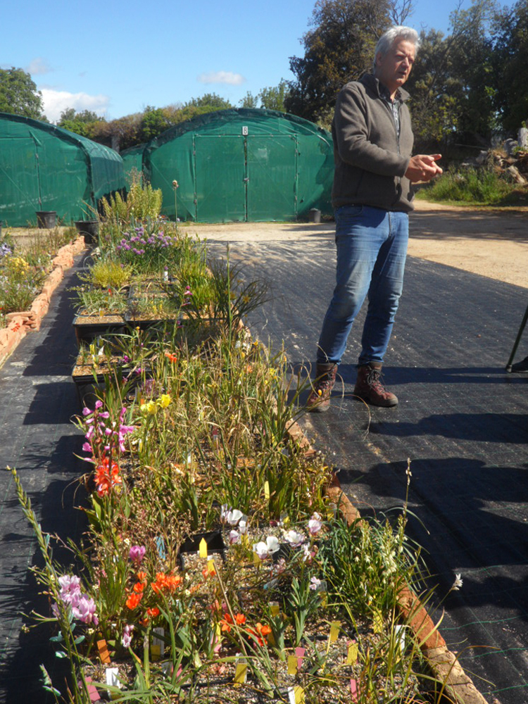 Johan Willm presented the stunning collection of plants, starting with those originating from South Africa, mainly the Western Cape. While the climate of the Western Cape is similar to our own, with winter rains and long dry periods in summer, in Mediterranean France frost can be a problem, as can too much heat on the plastic pots in the summer, hence the protective bricks. The geophytes in pots will be used as ‘mother’ plants from which to collect seeds to propagate plants for the garden.