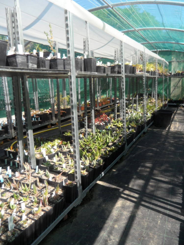 The succulent greenhouse also has a large number of species, 85% of which were obtained from seed. We were intrigued by the strange shapes of Euphorbia clava, Albuca spiralis and Lithops sp..