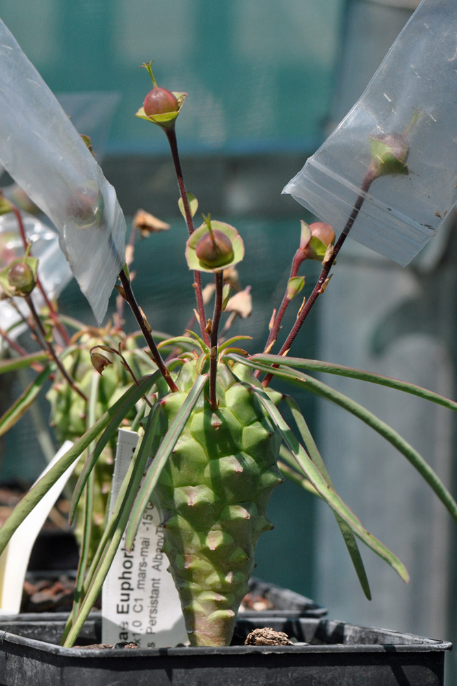 La serre des succulentes présente aussi un grand nombre d’espèces dont 85% ont été obtenues par semis. On admire les formes étranges des Euphorbia clava, Albuca spiralis et Lithops sp..