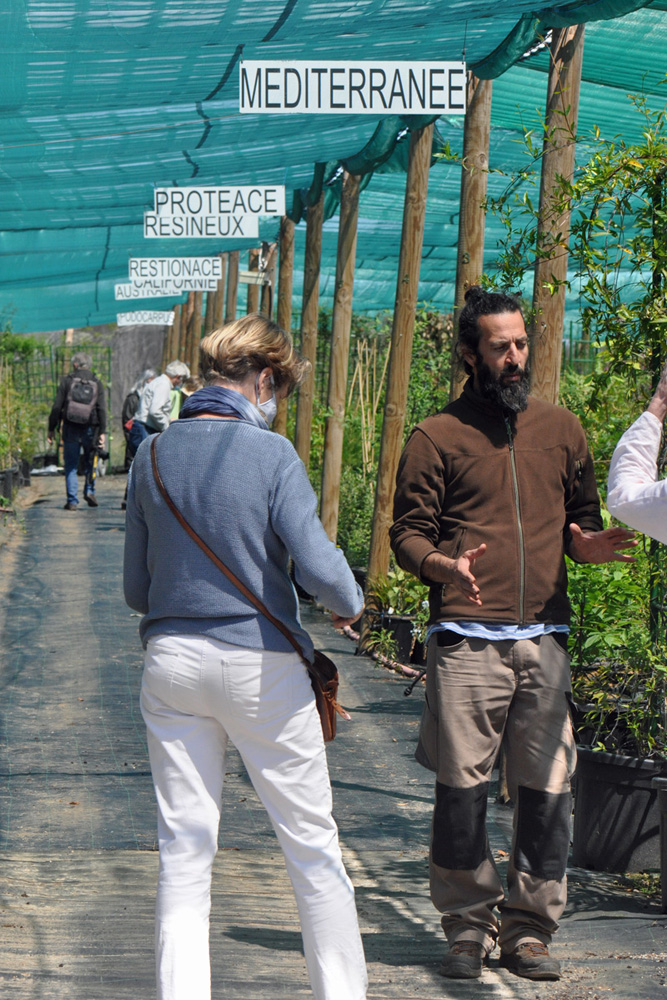 Johan Willm nous a présenté l’étonnante collection de plantes, en commençant par celles originaires d’Afrique du Sud, principalement du Cap occidental. Si le climat du Cap occidental est similaire au nôtre, avec des pluies hivernales et de longues périodes sèches en été, en France méditerranéenne, le gel peut être un problème, tout comme une chaleur trop importante sur les pots en plastique en été, d’où les briques de protection. Les géophytes en pots servent de plantes ” mères ” à partir desquelles on récoltera des graines pour multiplier les plantes du jardin.