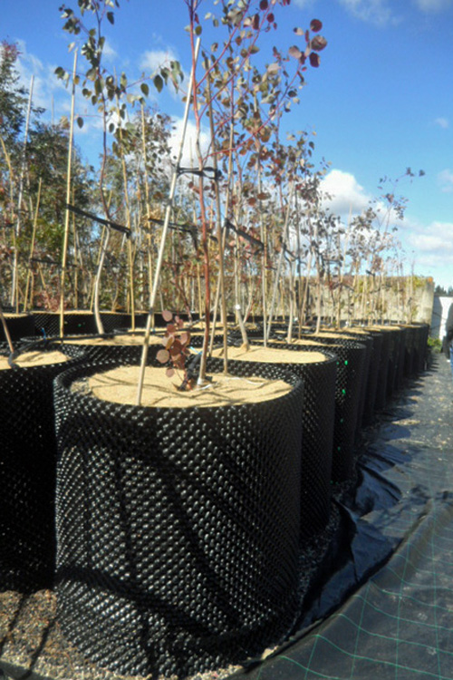 The plants are then placed under a shade sail to continue their growth. Many are grown in air-pots. These pots, originally developed for the cultivation of eucalyptus in Australia, are circular in shape, and consist of a perforated wall with closed cones on the inside and open cones on the outside. The cones on the inside channel the roots and lead them to the open cones on the outside. As they move outwards, the tips of the roots become dehydrated and wither away. This air-pruning process allows the plant to form many more knot-free roots.