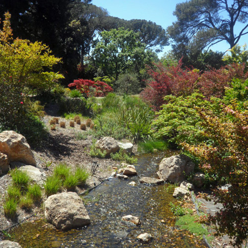 La visite se termine par le clou du spectacle qui démontre qu’une démarche botanique systématique et scientifique peut aussi permettre de créer un jardin paysager d’une grande beauté. Ce jardin dessiné par Jan-Willem Voss avec l’aide des botanistes est planté d’arbres centenaires tels que des pins parasol et d’Alep, des cyprès, ainsi que des cèdres de l’Atlas, du Liban et de l’Himalaya. Il s’organise autour d’une rivière artificielle de 130 m de long avec une alternance de plans d’eau, de cascades et rapides offrant différents points de vue et perspectives. Ainsi sont réalisées différentes ambiances végétales formant un paysage « naturel » bien qu’entièrement maîtrisé.