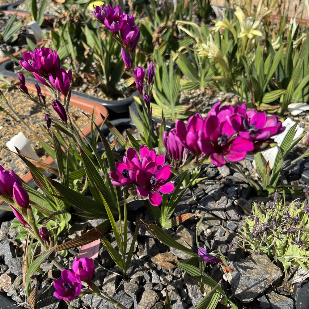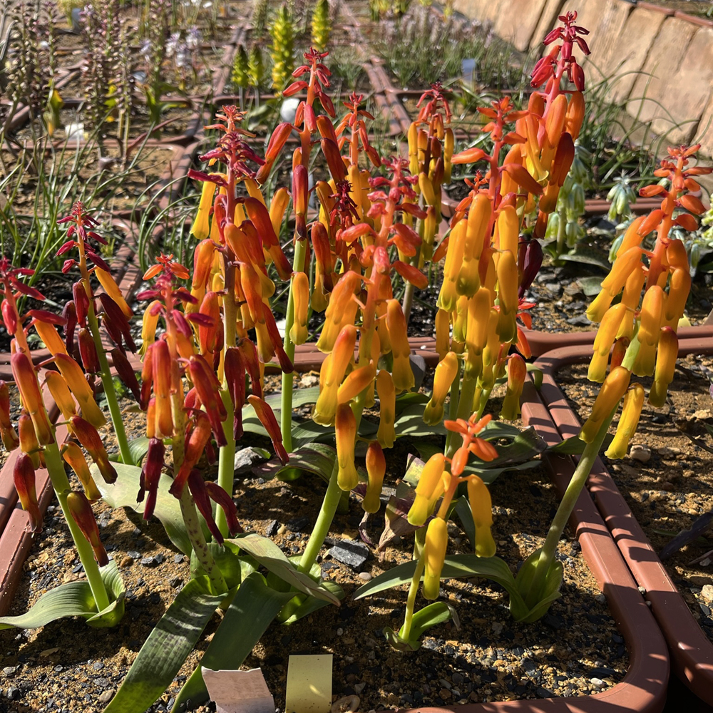 Les Lachenalia sont de petites plantes bulbeuses endémiques d’Afrique du Sud et de Namibie. La collection du Château Pérouse comprend 74 espèces. Dans le sud de la France, de nombreuses espèces sont faciles à cultiver et offrent un spectacle coloré du début de l’automne à la fin du printemps. Vous trouverez un article de Johan Willm sur les lachenalia dans la section Plantes du site. Parmi les autres bulbes sud-africains que nous avons admirés figurent des espèces de Babiana, Romulea, Sparaxis, Ixia et Moraea.