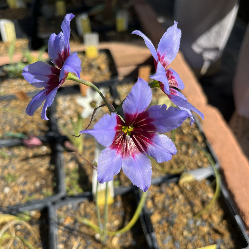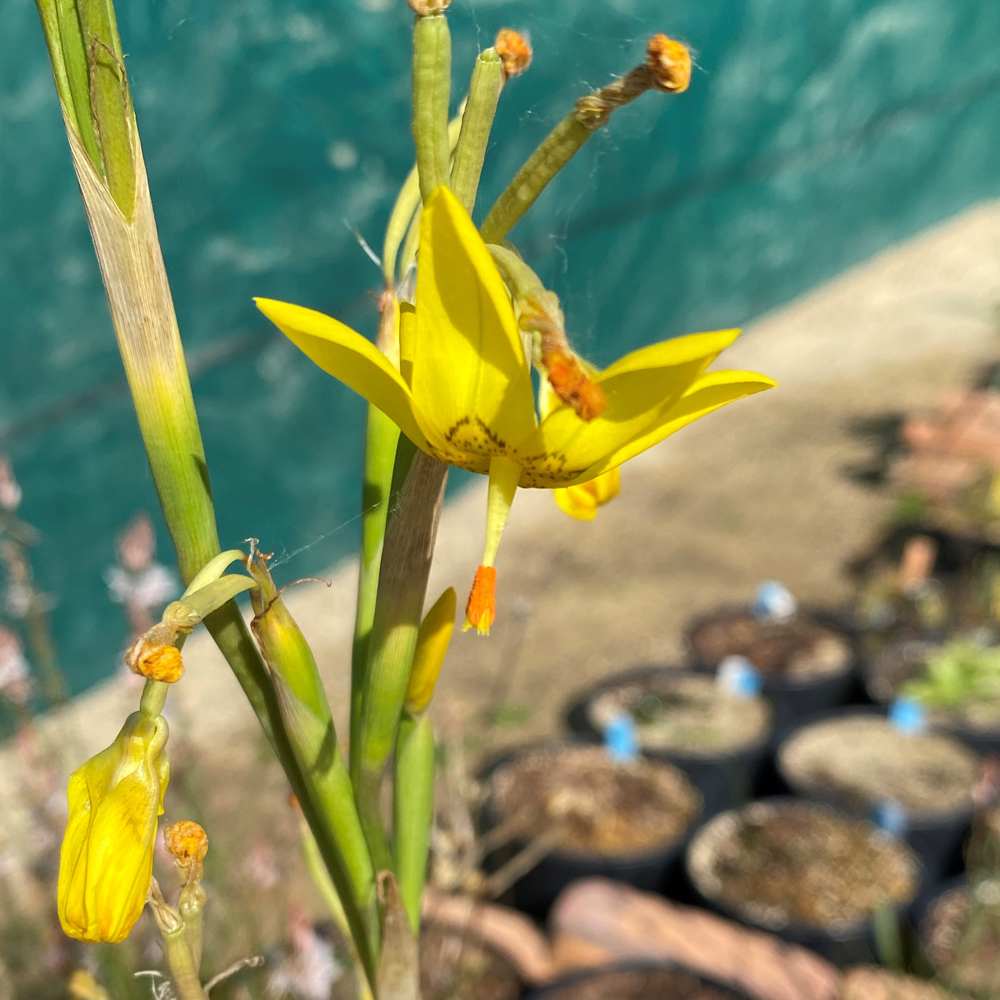 The focus on this visit was the geophyte collection, grown neatly in closely stacked rows of large square pots, sheltered by old flat bricks from a tumbledown wall on the property.