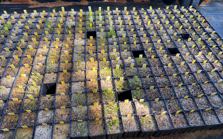 Avec Johan, nous nous sommes dirigés vers la zone de semis, à l’ombre de quelques vieux cèdres. Les graines sont semées en septembre dans des pots carrés classiques de 1,4 litre, et elles commencent à germer maintenant, en avril. Les semis ne bénéficient pas de la dormance requise par les plantes adultes mais sont irrigués régulièrement tout au long de l’été. À ce stade de leur développement, l’arrosage estival ne provoquera pas la pourriture des bulbes, alors que l’arrosage est à éviter lorsque les bulbes deviennent plus gros. Une fois encore, les pots sont disposés en rangs serrés pour offrir un abri maximal.