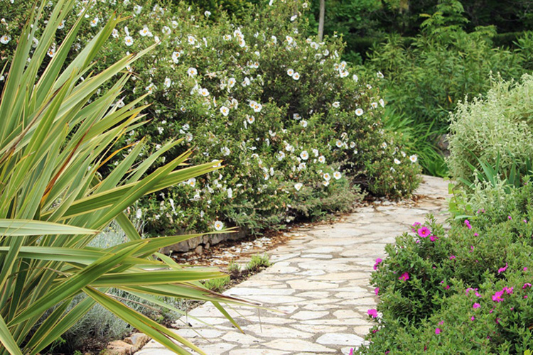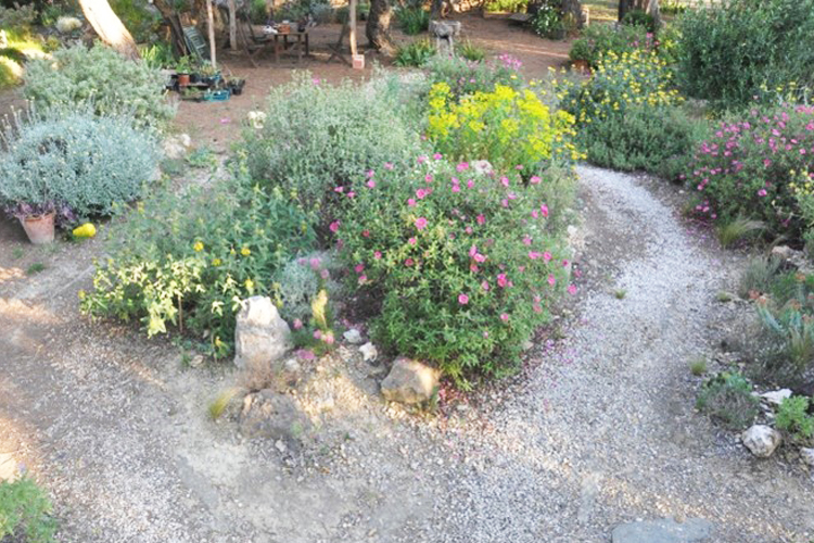 Using the garrigue as an inspiration, one can create large ground-covering flower beds and borders. Here, the individual plants do not act as ground cover, rather, the mass of shrubs growing together completely covers the soil.