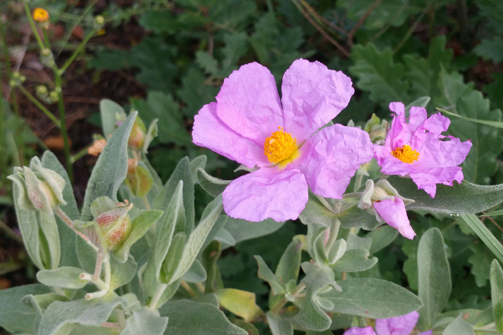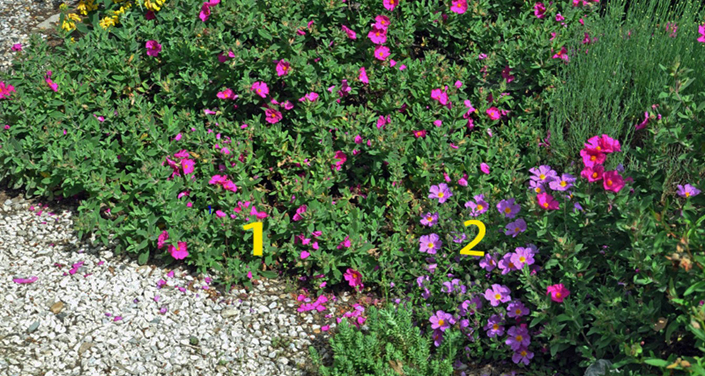 Cistus x pulverulentus (1) and Cistus creticus ‘Calcosalto’ (2)